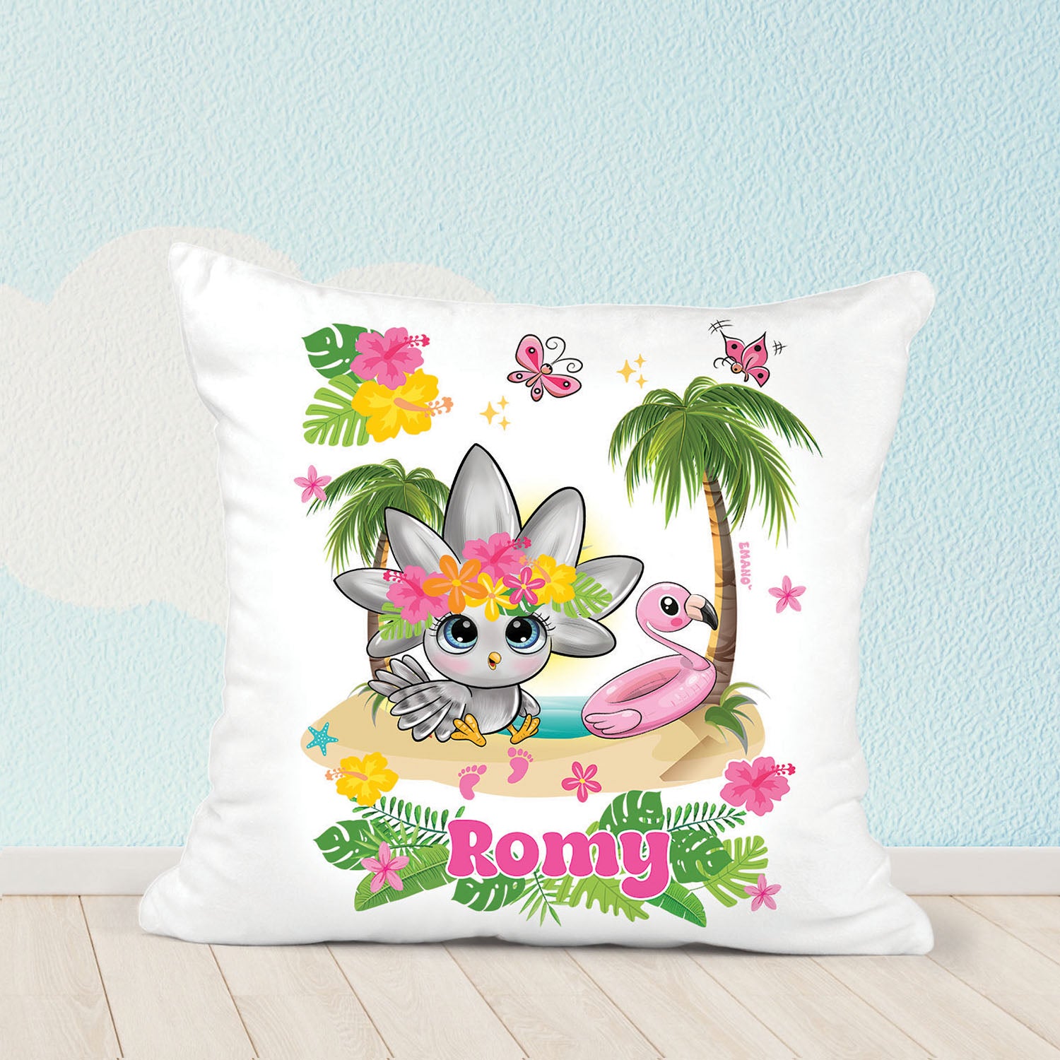 Coussin de naissance avec motif Cagou, souvenir doux et local imaginé en Nouvelle-Calédonie.