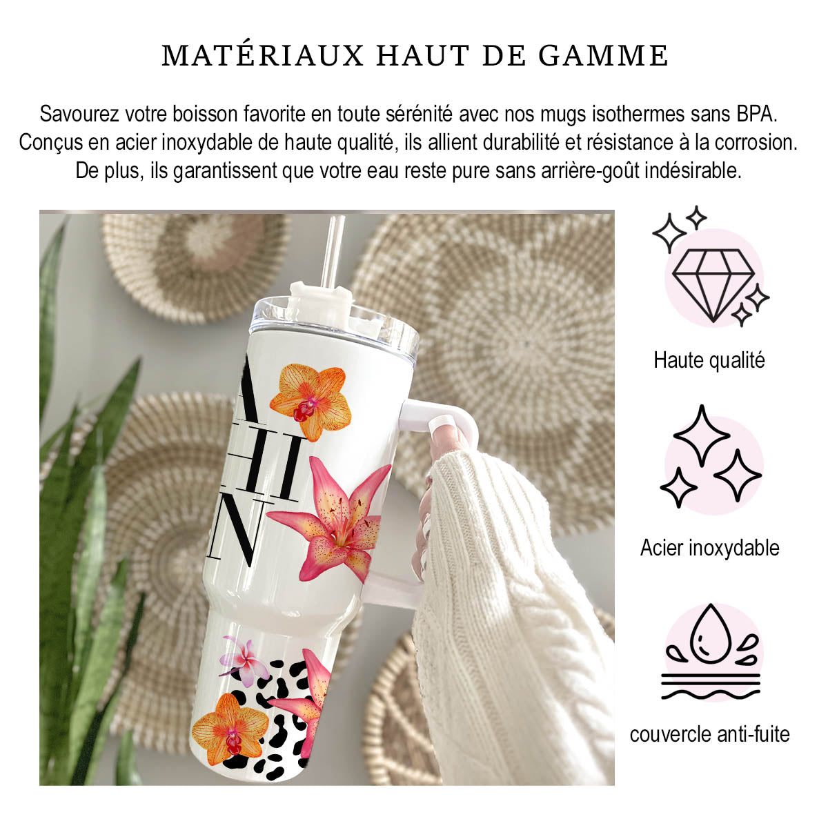 Mug isotherme Orléo Emano design léopard orchidées lys Nouvelle-Calédonie