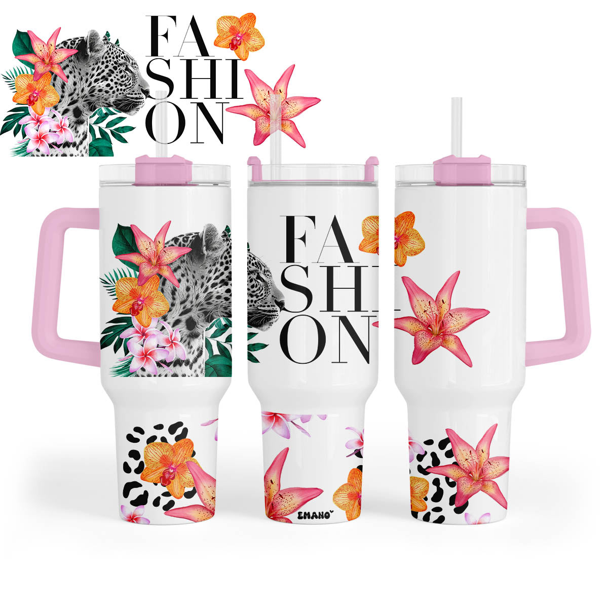 Laissez-vous séduire par Orléo, le mug isotherme signé Emano, qui fusionne l’audace du léopard 🐆 avec la délicatesse des orchidées et des lys 🌸.
