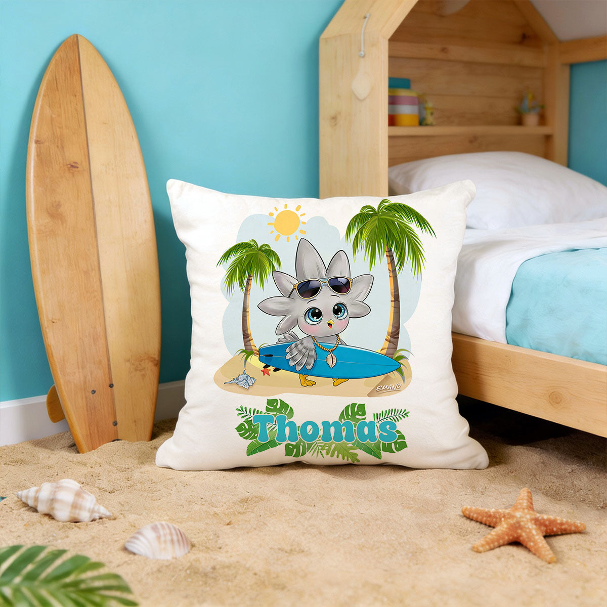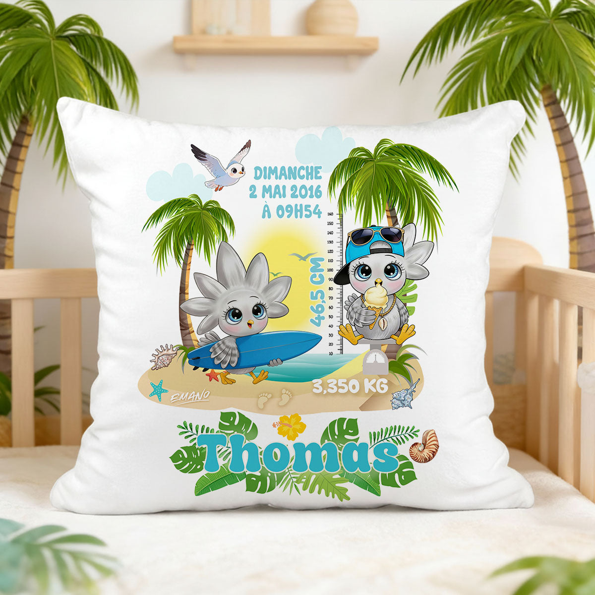 Offrez un souvenir unique et plein de douceur avec le coussin de naissance personnalisé Titou le Cagou, un personnage emblématique de l’univers EMANO, inspiré de la Nouvelle-Calédonie et de l’enfance ensoleillée.