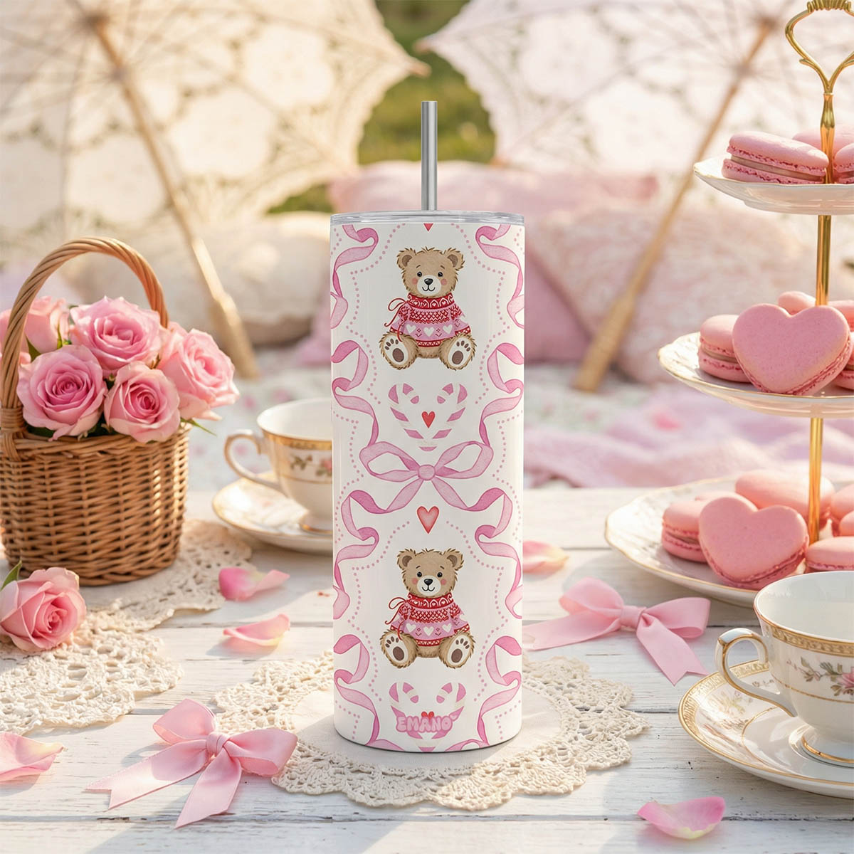 Avec ses adorables oursons en maille rose, ses nœuds délicats et ses motifs cœur, ce tumbler EMANO est pensé comme un vrai accessoire lifestyle : pratique, tendance et irrésistiblement cute.